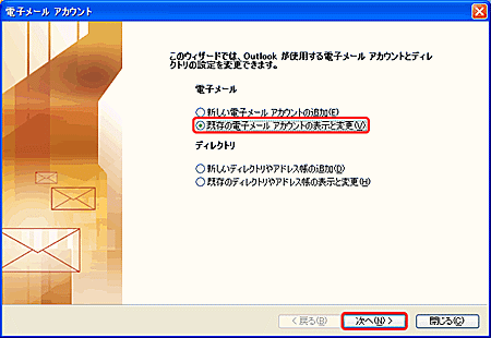 - 「既存の電子メールアカウントの表示と変更」を選択し「次へ」をクリックして下さい。